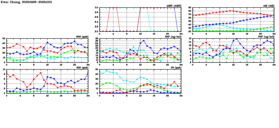 Air Quality Data Time Series in Kwai Chung (2025/10/01) | ( Line colors: Day -3 Day -2 Day -1 Current day ) | 2D Map Current AQHI |