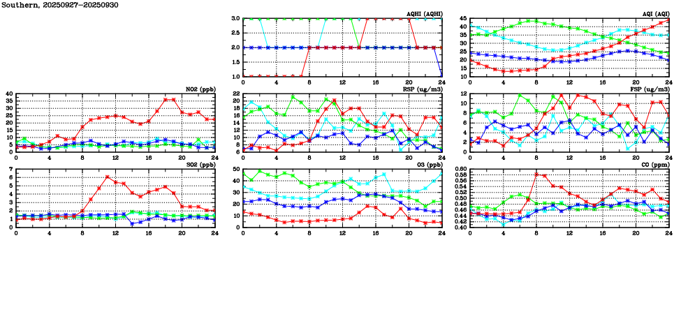 Air Quality Data Time Series in Southern (2025/09/30) | ( Line colors: Day -3 Day -2 Day -1 Current day ) | 2D Map Current AQHI |