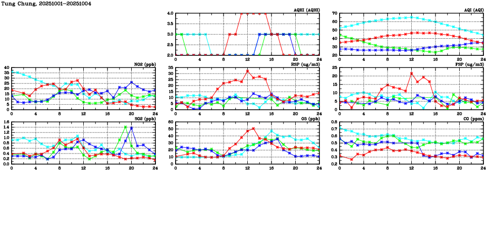 Air Quality Data Time Series in Tung Chung (2025/10/04) | ( Line colors: Day -3 Day -2 Day -1 Current day ) | 2D Map Current AQHI |