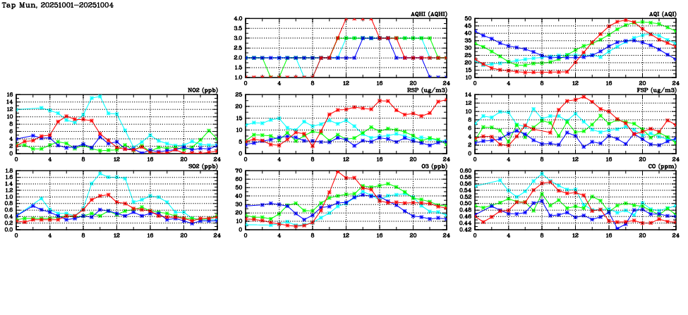 Air Quality Data Time Series in Tap Mun (2025/10/04) | ( Line colors: Day -3 Day -2 Day -1 Current day ) | 2D Map Current AQHI |