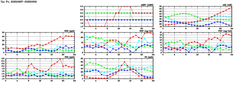 Air Quality Data Time Series in Tai Po (2025/09/30) | ( Line colors: Day -3 Day -2 Day -1 Current day ) | 2D Map Current AQHI |