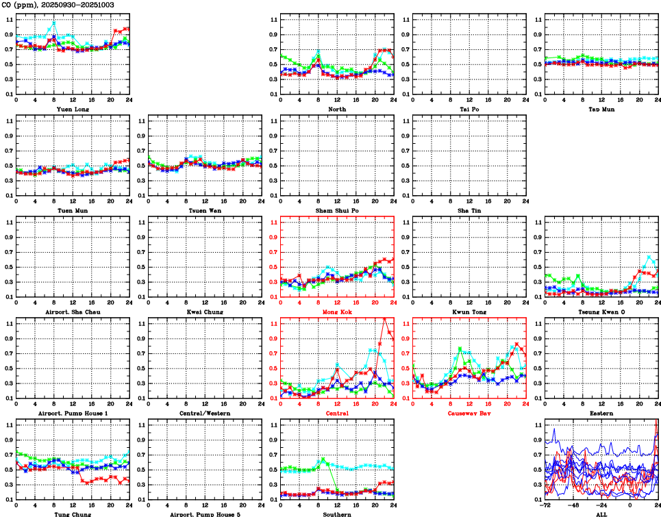Air Quality Data Time Series for CO (2025/10/03) | ( Line colors: Day -3 Day -2 Day -1 Current day ) | 2D Map Current AQHI |