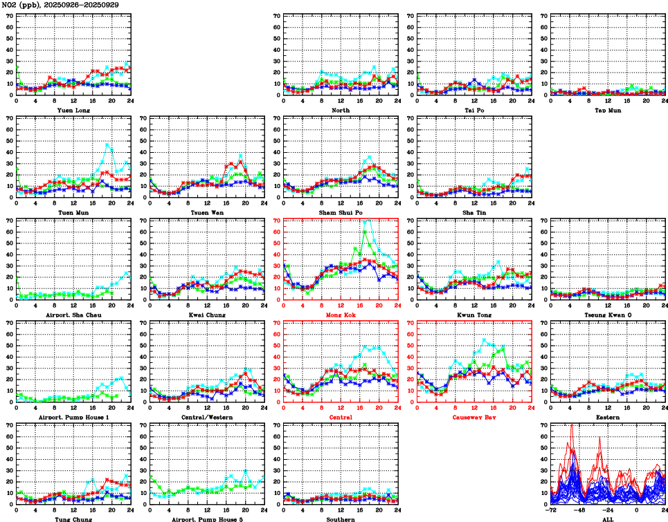 Air Quality Data Time Series for NO2 (2025/09/29) | ( Line colors: Day -3 Day -2 Day -1 Current day ) | 2D Map Current AQHI |