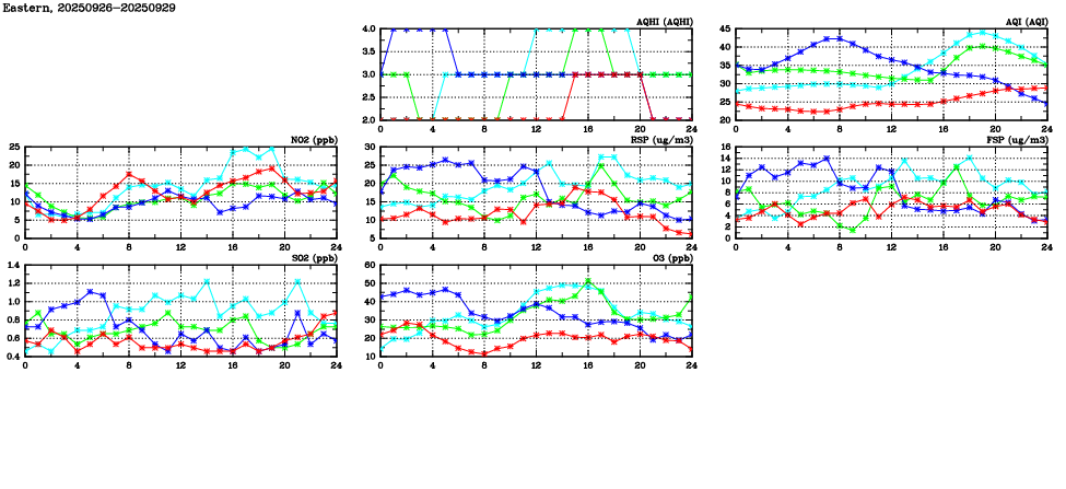 Air Quality Data Time Series in Eastern (2025/09/29) | ( Line colors: Day -3 Day -2 Day -1 Current day ) | 2D Map Current AQHI |