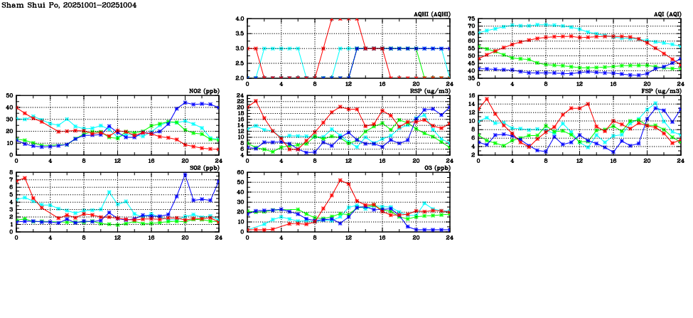 Air Quality Data Time Series in Sham Shui Po (2025/10/04) | ( Line colors: Day -3 Day -2 Day -1 Current day ) | 2D Map Current AQHI |