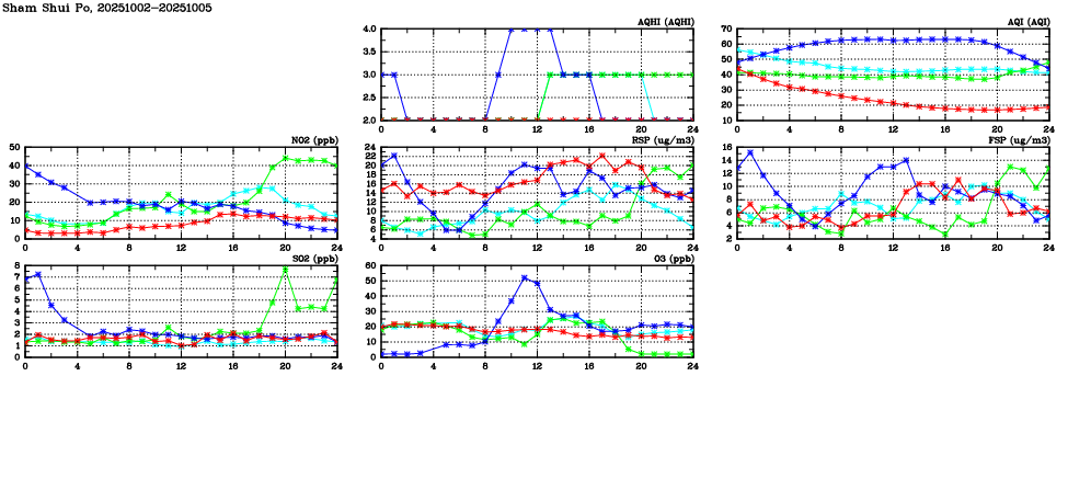 Air Quality Data Time Series in Sham Shui Po (2025/10/05) | ( Line colors: Day -3 Day -2 Day -1 Current day ) | 2D Map Current AQHI |
