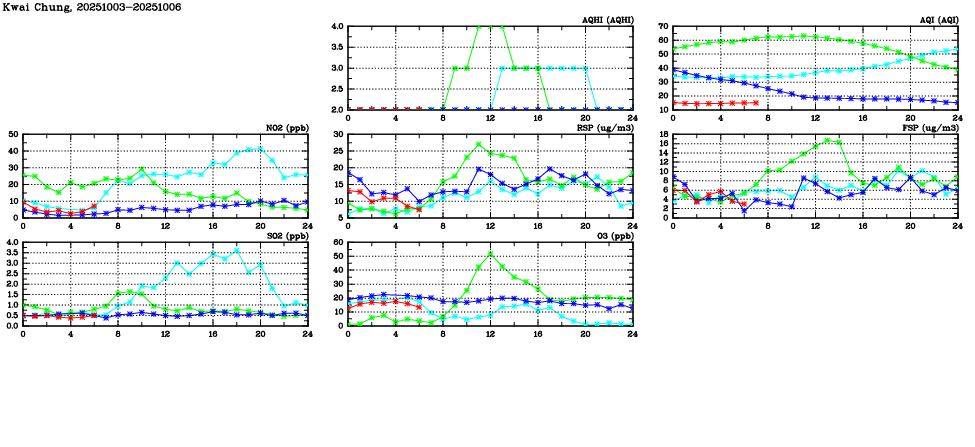 Air Quality Data Time Series in Kwai Chung (2025/10/06) | ( Line colors: Day -3 Day -2 Day -1 Current day ) | 2D Map Current AQHI |