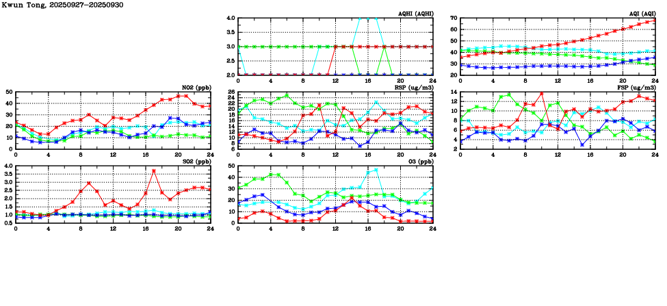 Air Quality Data Time Series in Kwun Tong (2025/09/30) | ( Line colors: Day -3 Day -2 Day -1 Current day ) | 2D Map Current AQHI |