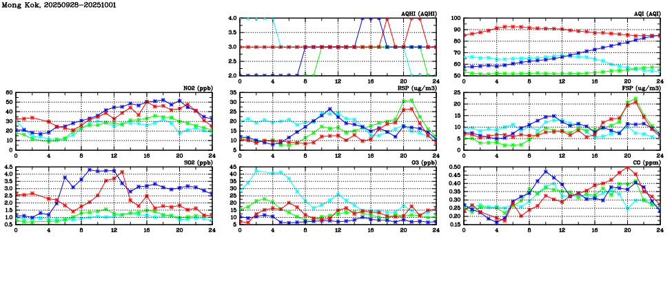Air Quality Data Time Series in Mong Kok (2025/10/01) | ( Line colors: Day -3 Day -2 Day -1 Current day ) | 2D Map Current AQHI |