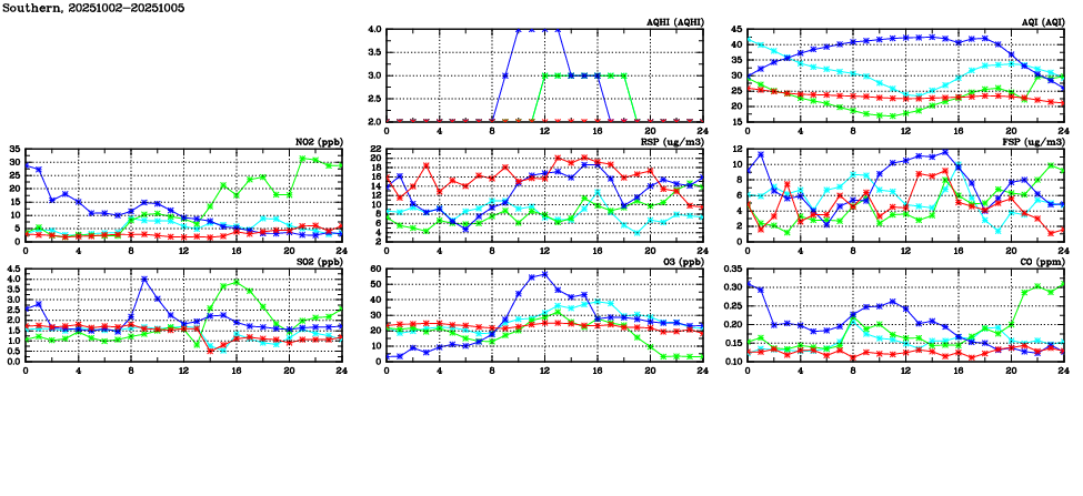 Air Quality Data Time Series in Southern (2025/10/05) | ( Line colors: Day -3 Day -2 Day -1 Current day ) | 2D Map Current AQHI |