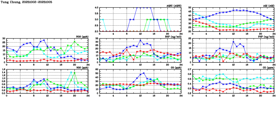 Air Quality Data Time Series in Tung Chung (2025/10/05) | ( Line colors: Day -3 Day -2 Day -1 Current day ) | 2D Map Current AQHI |