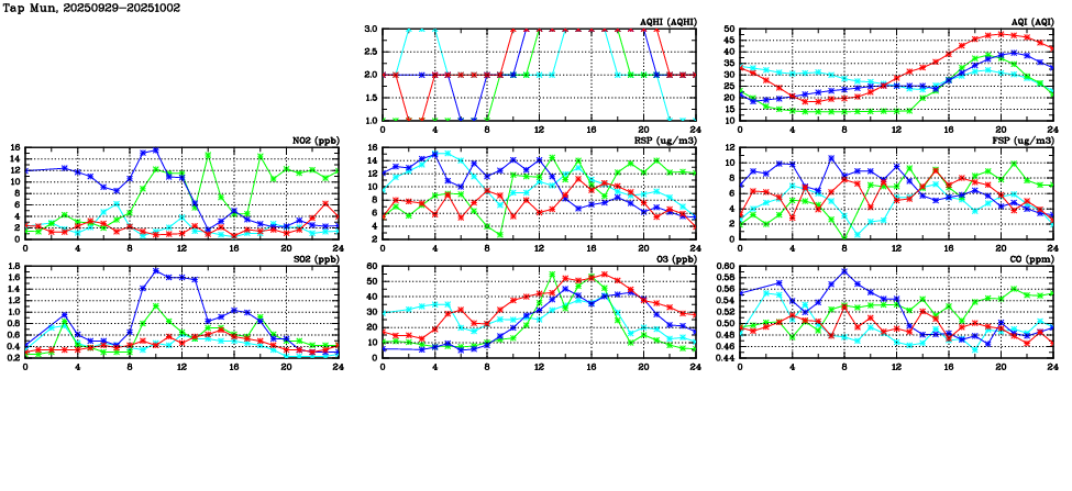 Air Quality Data Time Series in Tap Mun (2025/10/02) | ( Line colors: Day -3 Day -2 Day -1 Current day ) | 2D Map Current AQHI |