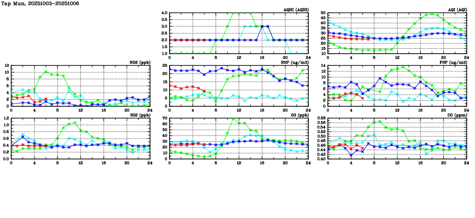 Air Quality Data Time Series in Tap Mun (2025/10/06) | ( Line colors: Day -3 Day -2 Day -1 Current day ) | 2D Map Current AQHI |