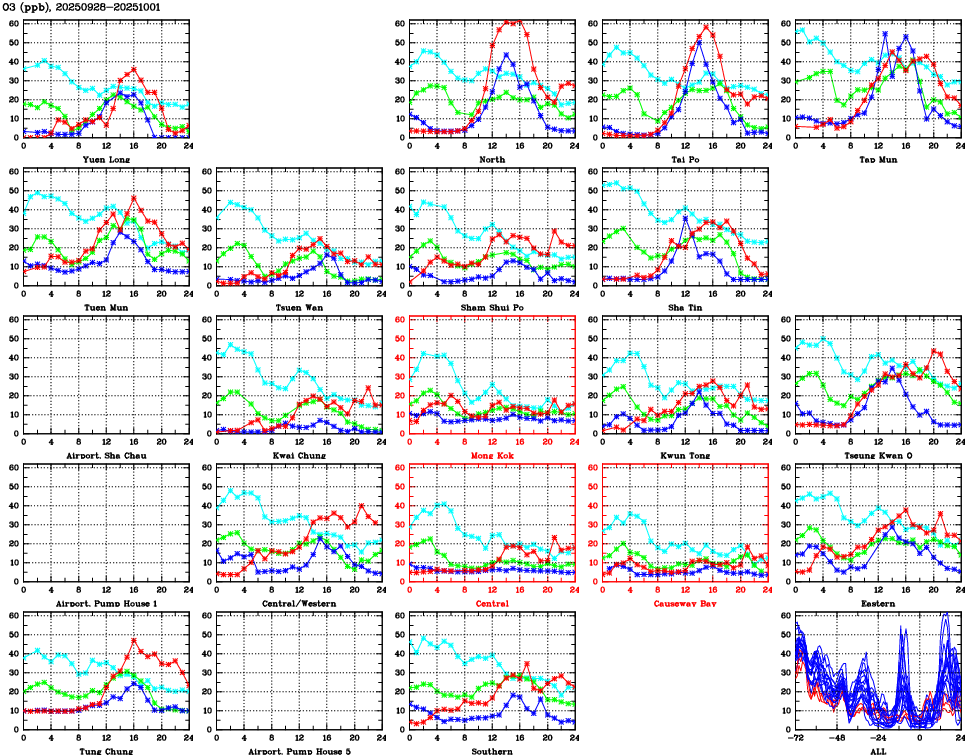 Air Quality Data Time Series for O3 (2025/10/01) | ( Line colors: Day -3 Day -2 Day -1 Current day ) | 2D Map Current AQHI |