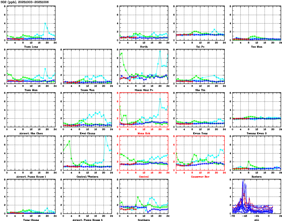 Air Quality Data Time Series for SO2 (2025/10/06) | ( Line colors: Day -3 Day -2 Day -1 Current day ) | 2D Map Current AQHI |