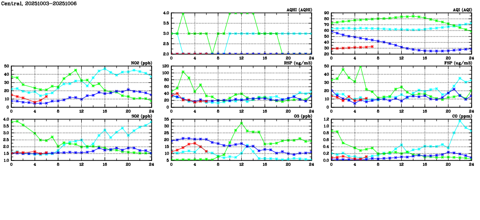 Air Quality Data Time Series in Central (2025/10/06) | ( Line colors: Day -3 Day -2 Day -1 Current day ) | 2D Map Current AQHI |