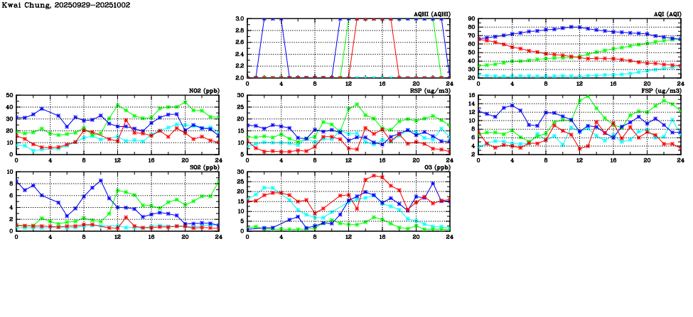 Air Quality Data Time Series in Kwai Chung (2025/10/02) | ( Line colors: Day -3 Day -2 Day -1 Current day ) | 2D Map Current AQHI |