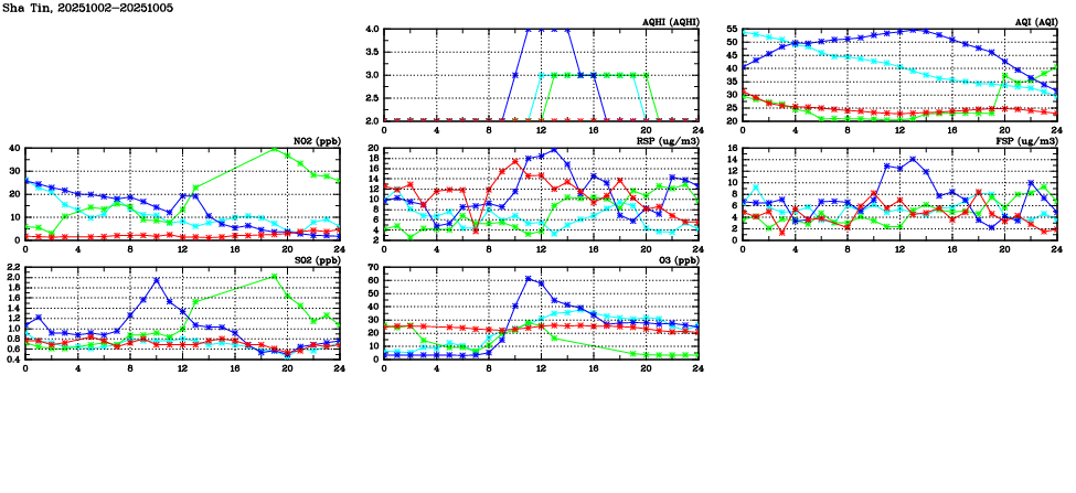Air Quality Data Time Series in Sha Tin (2025/10/05) | ( Line colors: Day -3 Day -2 Day -1 Current day ) | 2D Map Current AQHI |