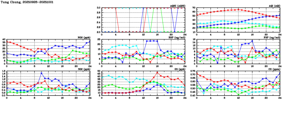 Air Quality Data Time Series in Tung Chung (2025/10/01) | ( Line colors: Day -3 Day -2 Day -1 Current day ) | 2D Map Current AQHI |