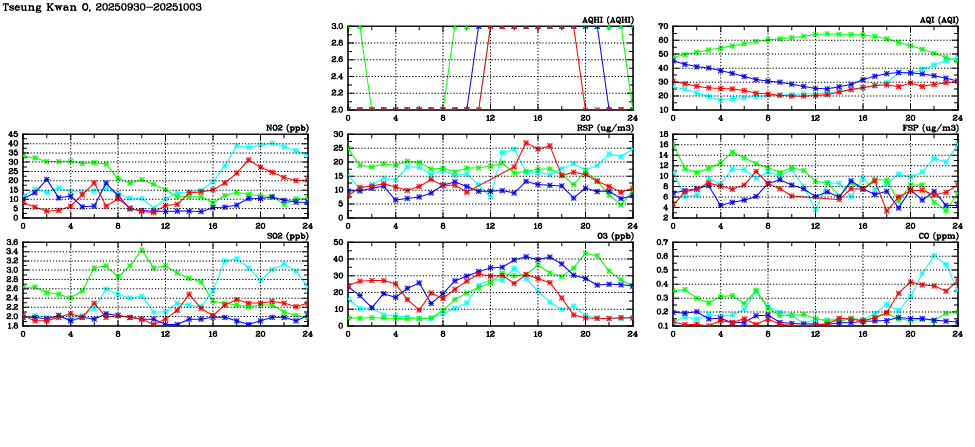 Air Quality Data Time Series in Tseung Kwan O (2025/10/03) | ( Line colors: Day -3 Day -2 Day -1 Current day ) | 2D Map Current AQHI |