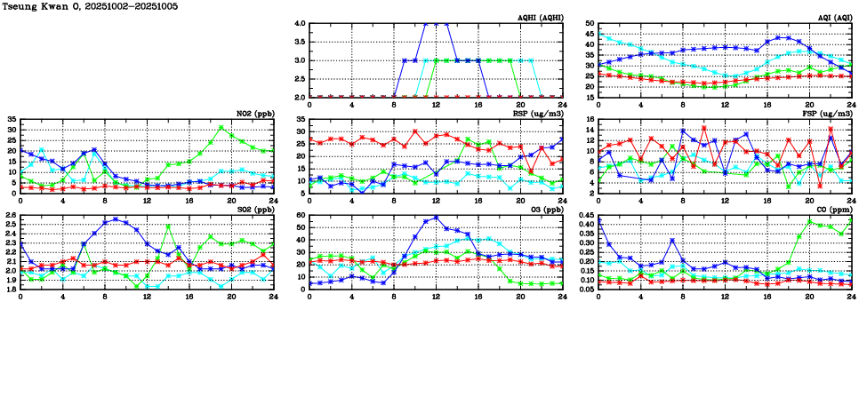 Air Quality Data Time Series in Tseung Kwan O (2025/10/05) | ( Line colors: Day -3 Day -2 Day -1 Current day ) | 2D Map Current AQHI |