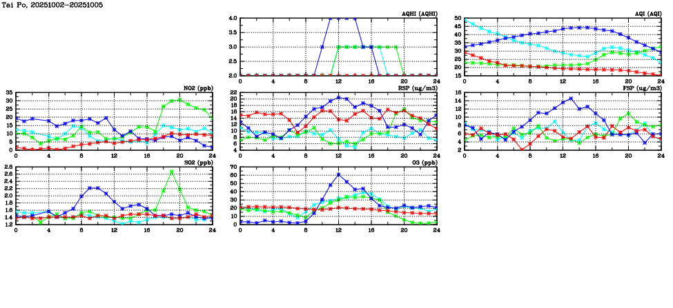 Air Quality Data Time Series in Tai Po (2025/10/05) | ( Line colors: Day -3 Day -2 Day -1 Current day ) | 2D Map Current AQHI |