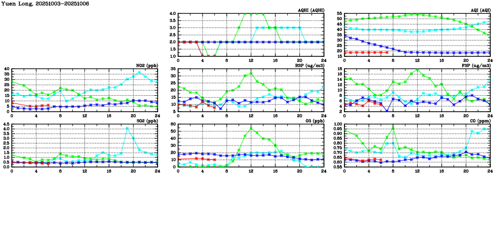 Air Quality Data Time Series in Yuen Long (2025/10/06) | ( Line colors: Day -3 Day -2 Day -1 Current day ) | 2D Map Current AQHI |