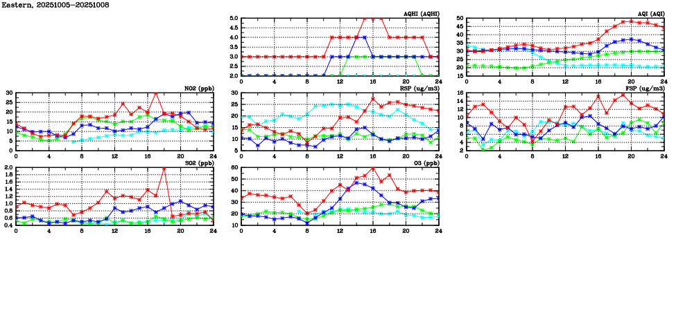 | Air Quality Data Time Series in Eastern (2025/10/08) | ( Line colors: Day -3 Day -2 Day -1 Current day ) | 2D Map Current AQHI |