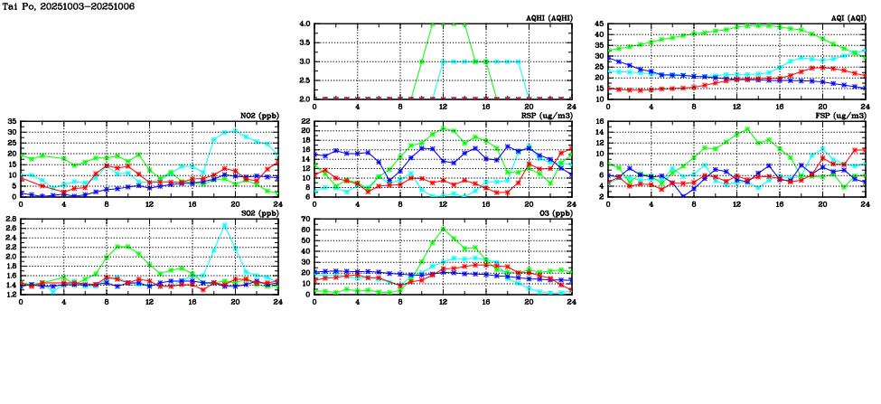 | Air Quality Data Time Series in Tai Po (2025/10/06) | ( Line colors: Day -3 Day -2 Day -1 Current day ) | 2D Map Current AQHI |