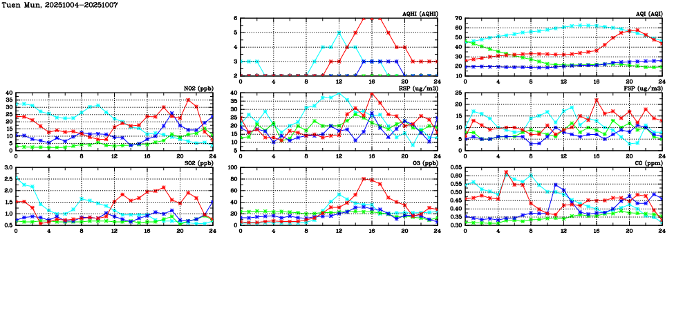 | Air Quality Data Time Series in Tuen Mun (2025/10/07) | ( Line colors: Day -3 Day -2 Day -1 Current day ) | 2D Map Current AQHI |