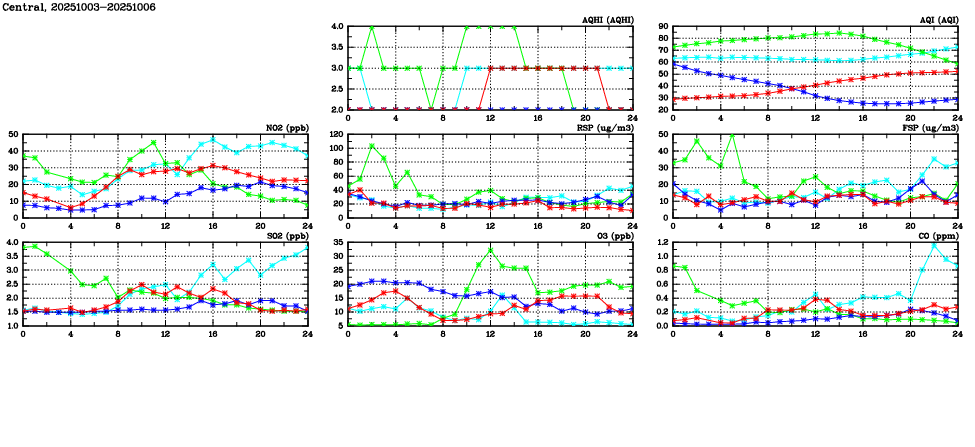 | Air Quality Data Time Series in Central (2025/10/06) | ( Line colors: Day -3 Day -2 Day -1 Current day ) | 2D Map Current AQHI |