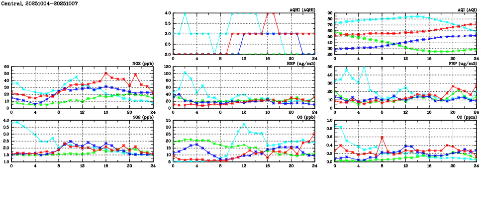 | Air Quality Data Time Series in Central (2025/10/07) | ( Line colors: Day -3 Day -2 Day -1 Current day ) | 2D Map Current AQHI |