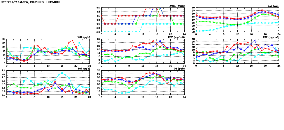 | Air Quality Data Time Series in Central/Western (2025/10/10) | ( Line colors: Day -3 Day -2 Day -1 Current day ) | 2D Map Current AQHI |