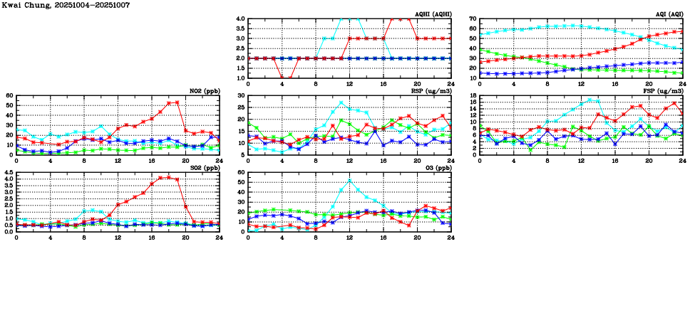 | Air Quality Data Time Series in Kwai Chung (2025/10/07) | ( Line colors: Day -3 Day -2 Day -1 Current day ) | 2D Map Current AQHI |
