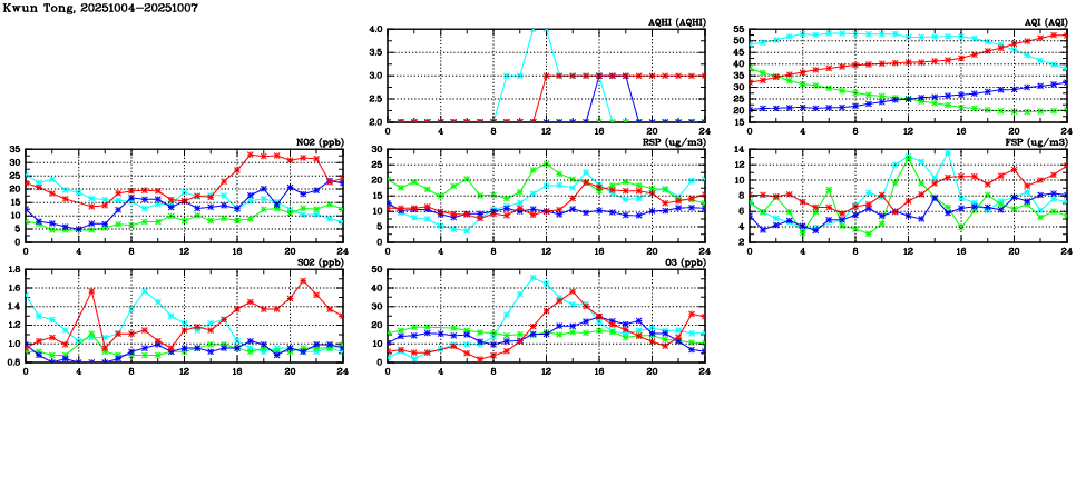 | Air Quality Data Time Series in Kwun Tong (2025/10/07) | ( Line colors: Day -3 Day -2 Day -1 Current day ) | 2D Map Current AQHI |