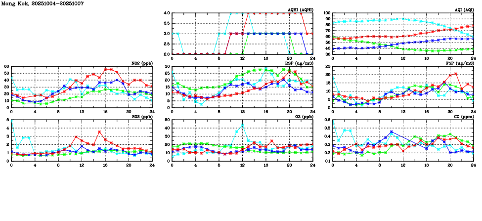 | Air Quality Data Time Series in Mong Kok (2025/10/07) | ( Line colors: Day -3 Day -2 Day -1 Current day ) | 2D Map Current AQHI |