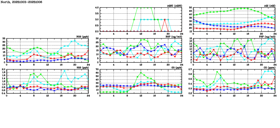 | Air Quality Data Time Series in North (2025/10/06) | ( Line colors: Day -3 Day -2 Day -1 Current day ) | 2D Map Current AQHI |
