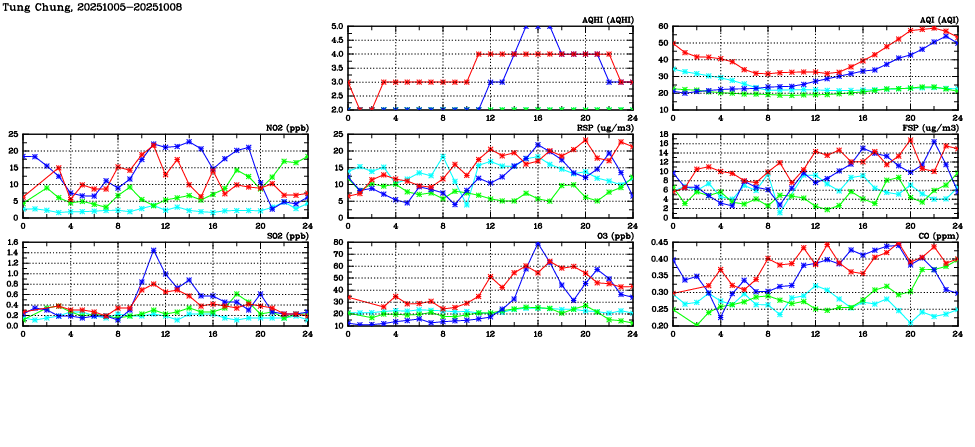 | Air Quality Data Time Series in Tung Chung (2025/10/08) | ( Line colors: Day -3 Day -2 Day -1 Current day ) | 2D Map Current AQHI |
