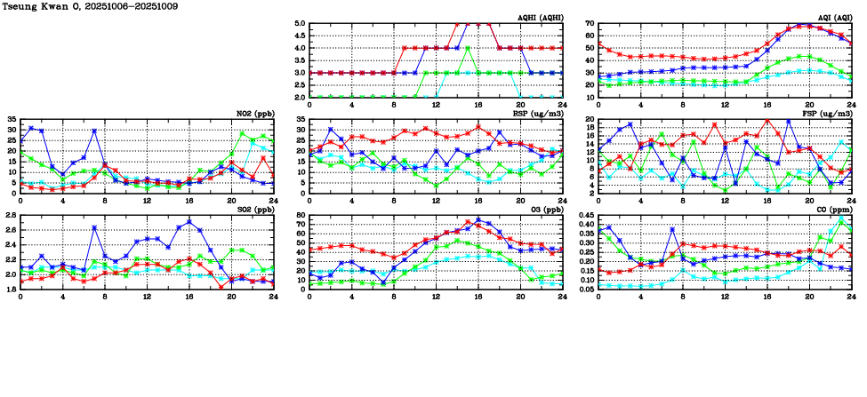 | Air Quality Data Time Series in Tseung Kwan O (2025/10/09) | ( Line colors: Day -3 Day -2 Day -1 Current day ) | 2D Map Current AQHI |