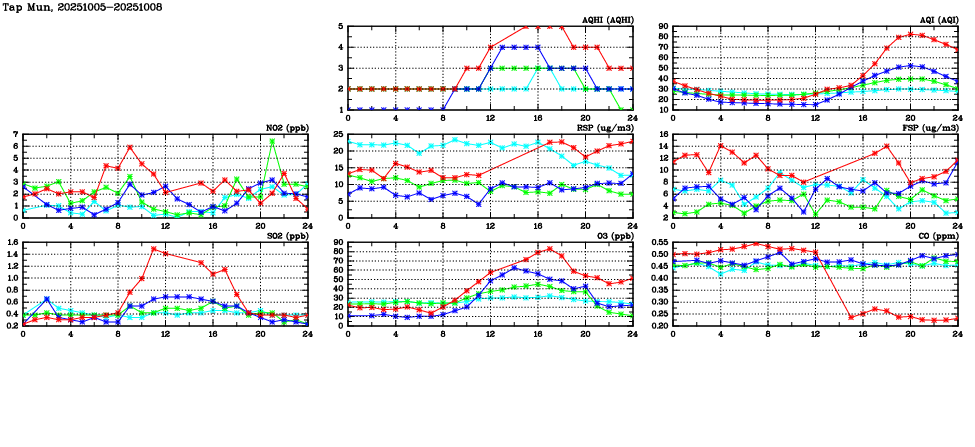 | Air Quality Data Time Series in Tap Mun (2025/10/08) | ( Line colors: Day -3 Day -2 Day -1 Current day ) | 2D Map Current AQHI |