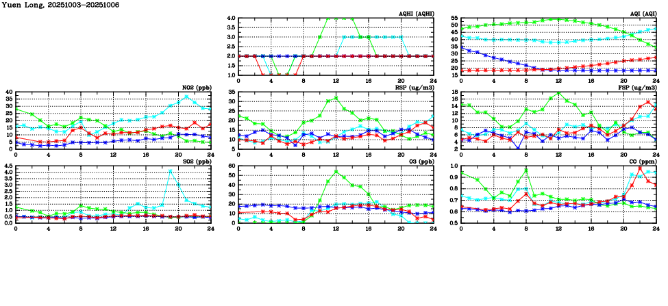 | Air Quality Data Time Series in Yuen Long (2025/10/06) | ( Line colors: Day -3 Day -2 Day -1 Current day ) | 2D Map Current AQHI |