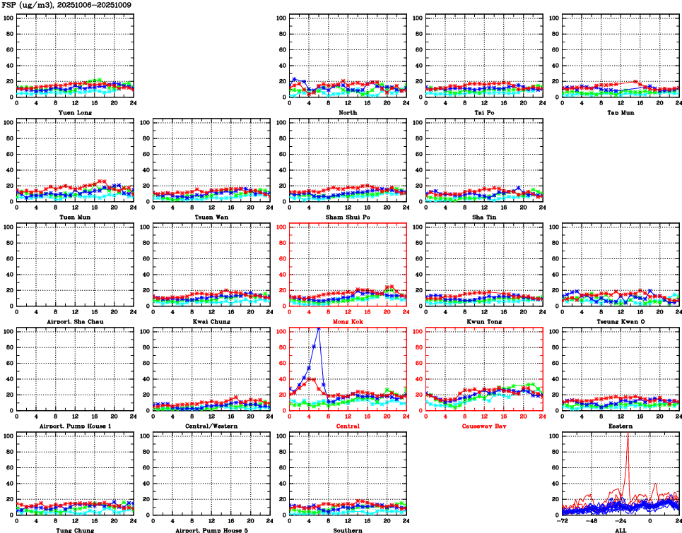 | Air Quality Data Time Series for FSP (2025/10/09) | ( Line colors: Day -3 Day -2 Day -1 Current day ) | 2D Map Current AQHI |