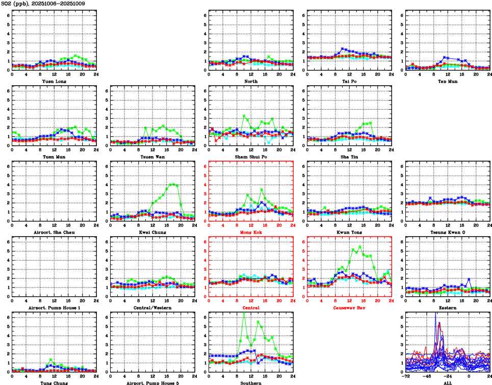 | Air Quality Data Time Series for SO2 (2025/10/09) | ( Line colors: Day -3 Day -2 Day -1 Current day ) | 2D Map Current AQHI |