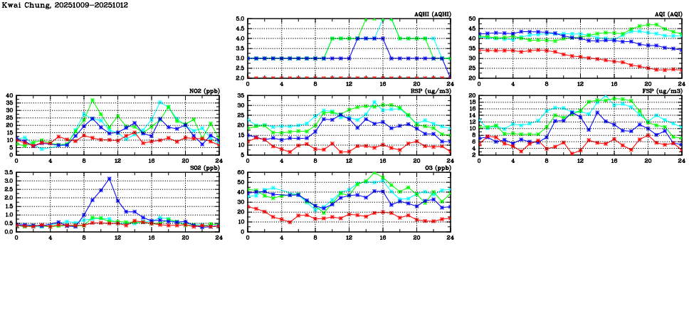 | Air Quality Data Time Series in Kwai Chung (2025/10/12) | ( Line colors: Day -3 Day -2 Day -1 Current day ) | 2D Map Current AQHI |