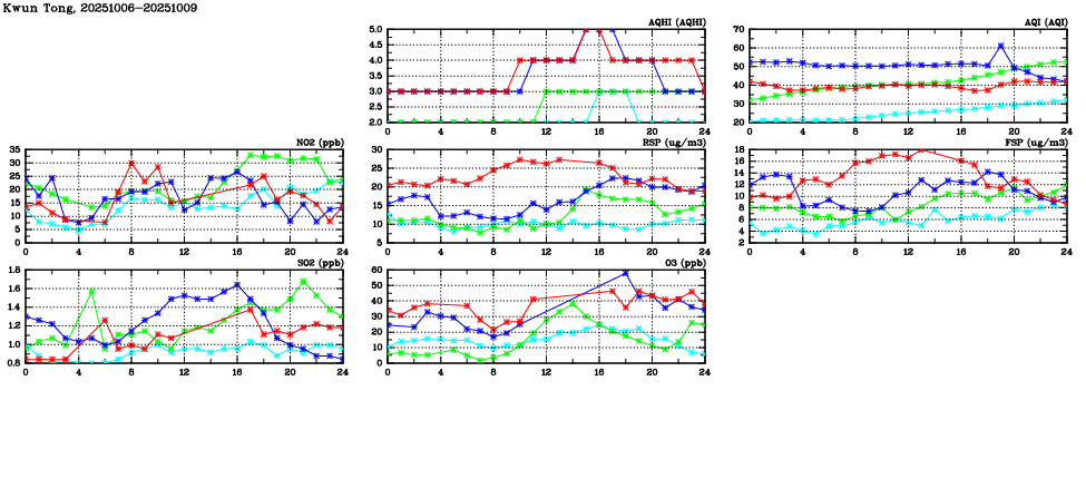 | Air Quality Data Time Series in Kwun Tong (2025/10/09) | ( Line colors: Day -3 Day -2 Day -1 Current day ) | 2D Map Current AQHI |