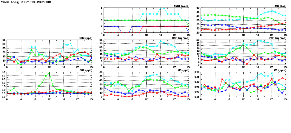 | Air Quality Data Time Series in Yuen Long (2025/10/13) | ( Line colors: Day -3 Day -2 Day -1 Current day ) | 2D Map Current AQHI |