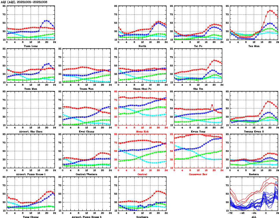 | Air Quality Data Time Series for AQI (2025/10/08) | ( Line colors: Day -3 Day -2 Day -1 Current day ) | 2D Map Current AQHI |