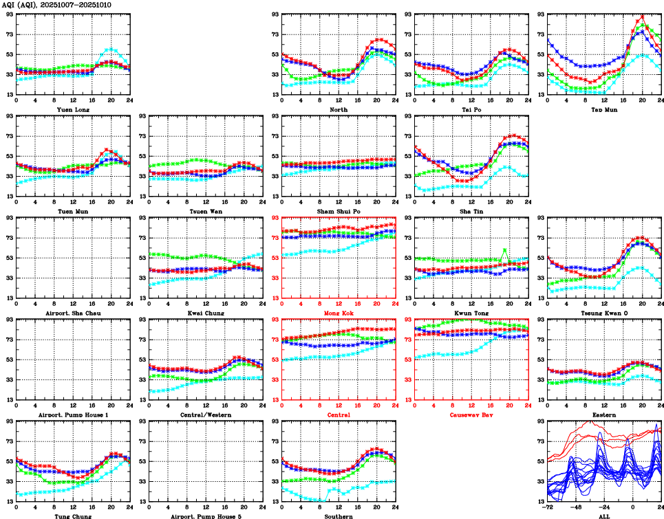 | Air Quality Data Time Series for AQI (2025/10/10) | ( Line colors: Day -3 Day -2 Day -1 Current day ) | 2D Map Current AQHI |