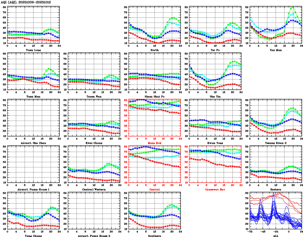 | Air Quality Data Time Series for AQI (2025/10/12) | ( Line colors: Day -3 Day -2 Day -1 Current day ) | 2D Map Current AQHI |