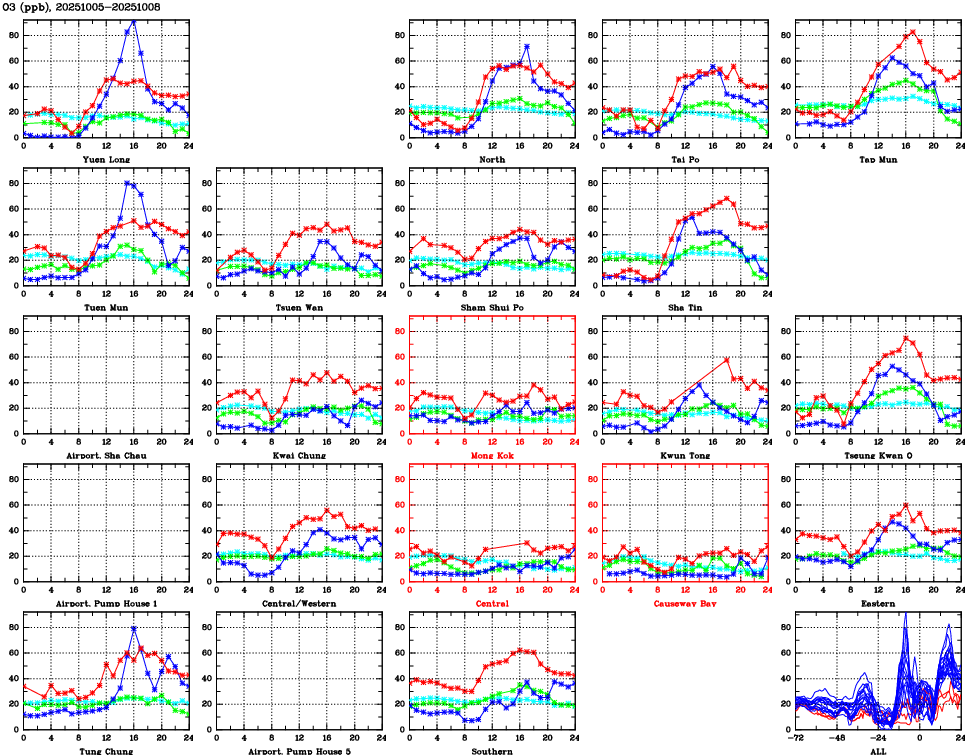 | Air Quality Data Time Series for O3 (2025/10/08) | ( Line colors: Day -3 Day -2 Day -1 Current day ) | 2D Map Current AQHI |